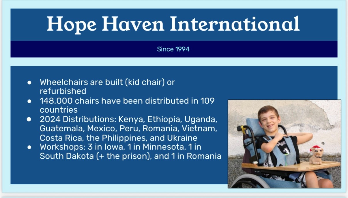 AmberBeth spoke to the Club about a mission trip she took to Ukraine via Romania. The trip was part of an effort led by Hope Haven to provide wheel chairs for individuals in need. AmberBeth was able to connect with multiple Rotary Clubs as part of this effort.